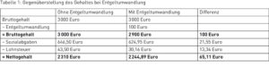 Der Arbeitnehmer spart mit seiner monatlichen Entgeltumwandlung i. H. v. 100 Euro, monatlich 34,89 Euro an Steuer und Sozialabgaben. Auf Seiten des Arbeitgebers kommt es zu einem Ersparnis an Sozialabgaben, sodass er 15 % von dem umgewandelten Entgelt (15 % von 100 Euro = 15 Euro) als Arbeitgeberzuschuss an den Pensionsfonds, die Pensionskasse oder die Direktversicherung zu leisten hat (15 Euro < 21,55 Euro).